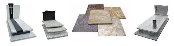 Если говорить о материалах, применяемых для создания могильных плит, то можно отметить, что немалое распространение получили натуральные камни — мрамор и гранит. Первый вариант позволяет получить изящные композиции и надгробия оригинальной формы. Но следует помнить, что без специального защитного покрытия и регулярной чистки мрамор быстро теряет свой привлекательный вид. Гранитные плиты менее требовательны к уходу. Зачастую при создании надгробий применяется материал чёрного цвета, но такие изделия выглядят чрезмерно строго. Поэтому нередко в памятнике также присутствуют серые и красные оттенки гранита.