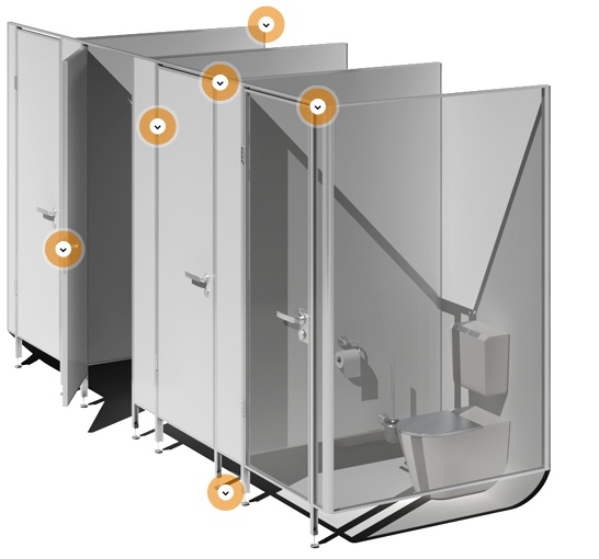 Посредством перегородок проходит деление всего доступного в санузле пространства на отдельные кабинки. За счет этого воспользоваться уборной может единовременно достаточно значительное число сотрудников. Нельзя сбрасывать со счетов и фактор личного пространства, а также ту эстетичность, которую обретает помещение с подобными конструкциями.