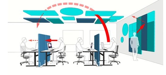 Наличие большего количества людей, работающих в большом помещении, влечет за собой проблему распространения звука, источником которого выступают разговоры между сотрудником, телефон, работа офисного оборудования и кондиционирования воздуха. Данную проблему можно решить, адекватно организовывая работу, при помощи офисных перегородок закрытого типа, которые позволяют должным образом легко встроиться в интерьер одновременно снижая до минимума лишний шум. Кроме того, подобные устройства особенно приемлемы в стратегически важных местах, таких как комнаты переговоров, конференц-залы.