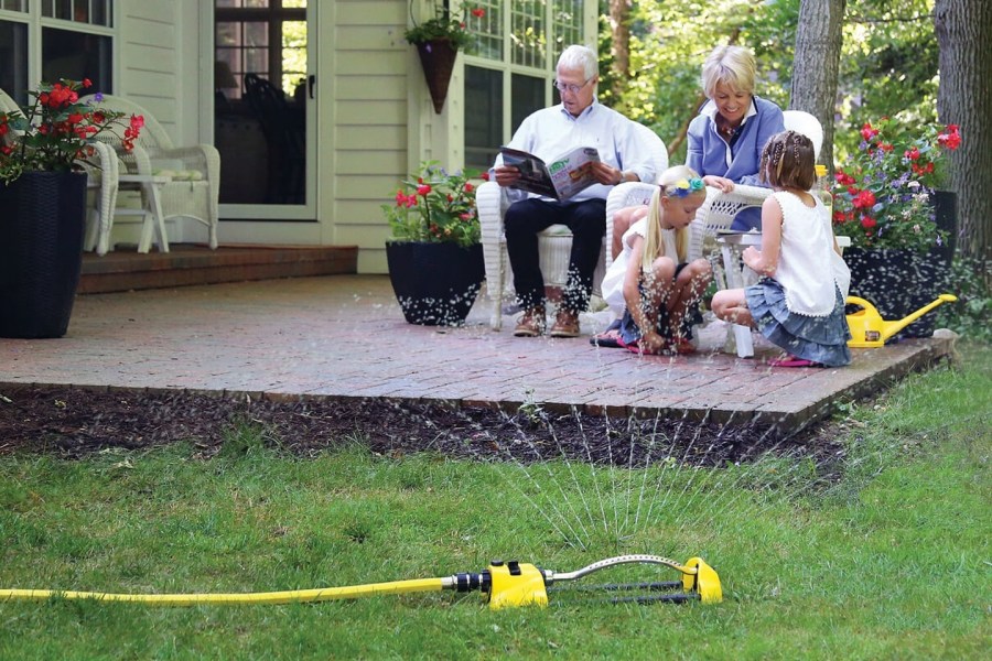 Когда вам нужно полить газон, устройства поднимаются над уровнем грунта, выполняют свою задачу, а после снова прячутся в землю. У этого типа устройств относительно небольшая дальность полива составляющая всего 4-7 метров, но эта характеристика компенсируется плотностью установки на квадратный метр. Можно пойти и другим путем, купив дорогие дождеватели, у которых радиус действия больше.